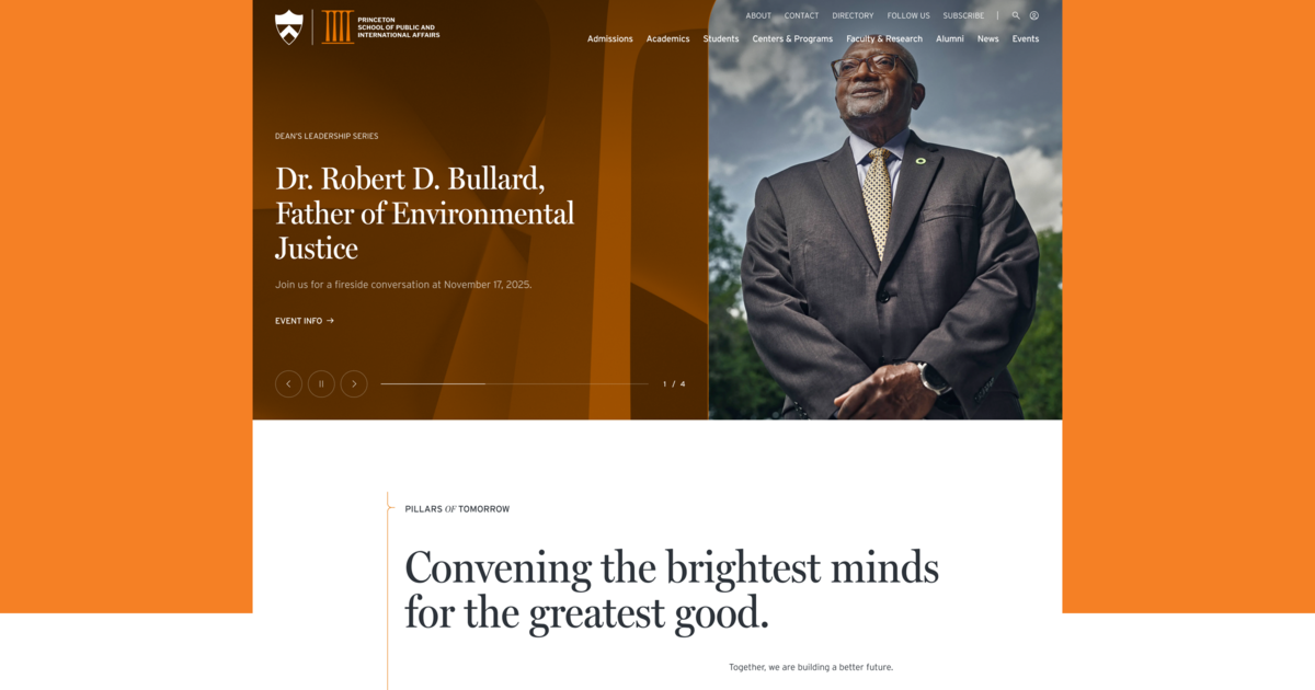 Evolving Web collabore depuis de nombreuses années avec l’École des affaires publiques et internationales de Princeton (SPIA) et soutient l'évolution de sa présence numérique alors que l'école continue de former les futurs leaders politiques mondiaux. Au cours de notre collaboration, nous avons amélioré l'expérience utilisateur, renforcé les intégrations avec l'écosystème de l'université de Princeton, modernisé la plateforme et affiné la manière dont la SPIA raconte son histoire en ligne.