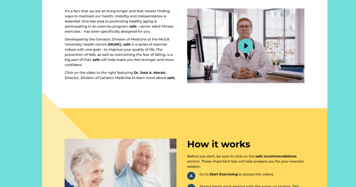 Evolving Web s’est associé à la Division de gériatrie de l’Université McGill pour créer Safe, un site Web comprenant des tutoriels vidéo qui vise à encourager les aînés à améliorer leur qualité de vie en faisant de l’exercice. Evolving Web a conçu le site, imaginé son design, son image de marque (logo, palette de couleurs, choix des polices et langage visuel général) ainsi que l’expérience utilisateur, et a coordonné la production des vidéos.