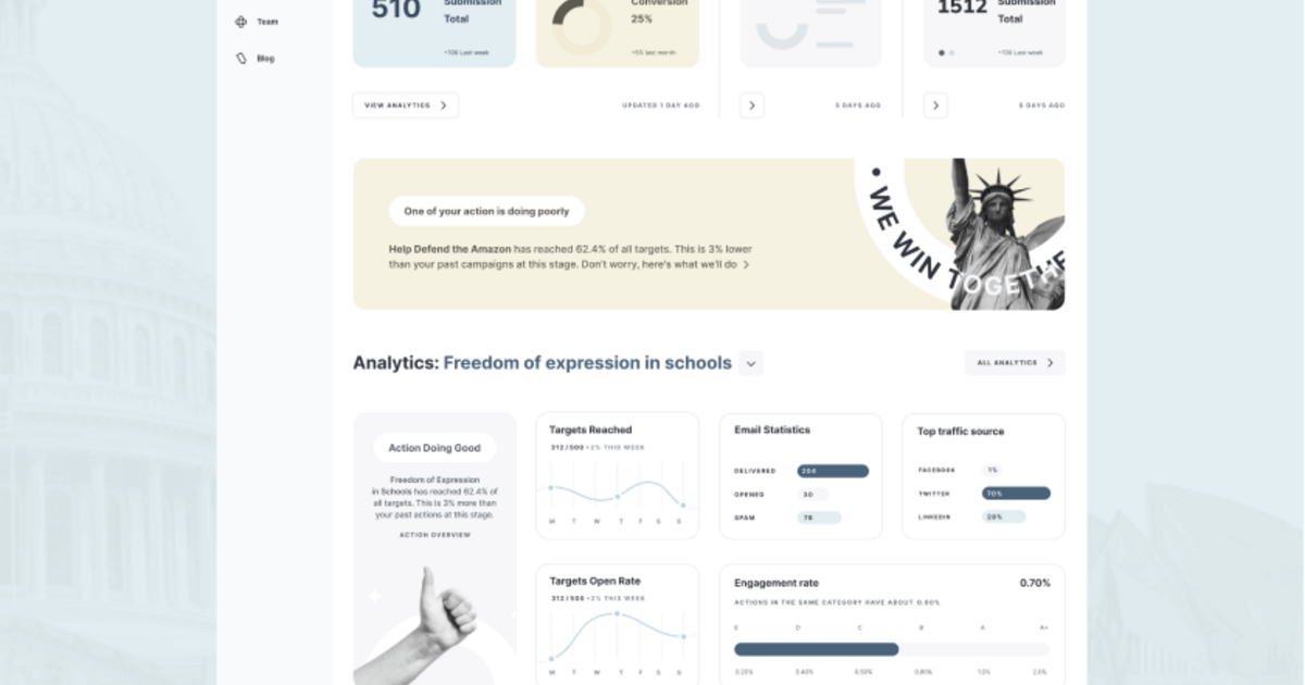 - Conception d'un nouveau flux pour la création de campagnes de plaidoyer qui soit facile et rapide, tout en offrant des fonctionnalités avancées et en fournissant des statistiques sur les résultats de la campagne