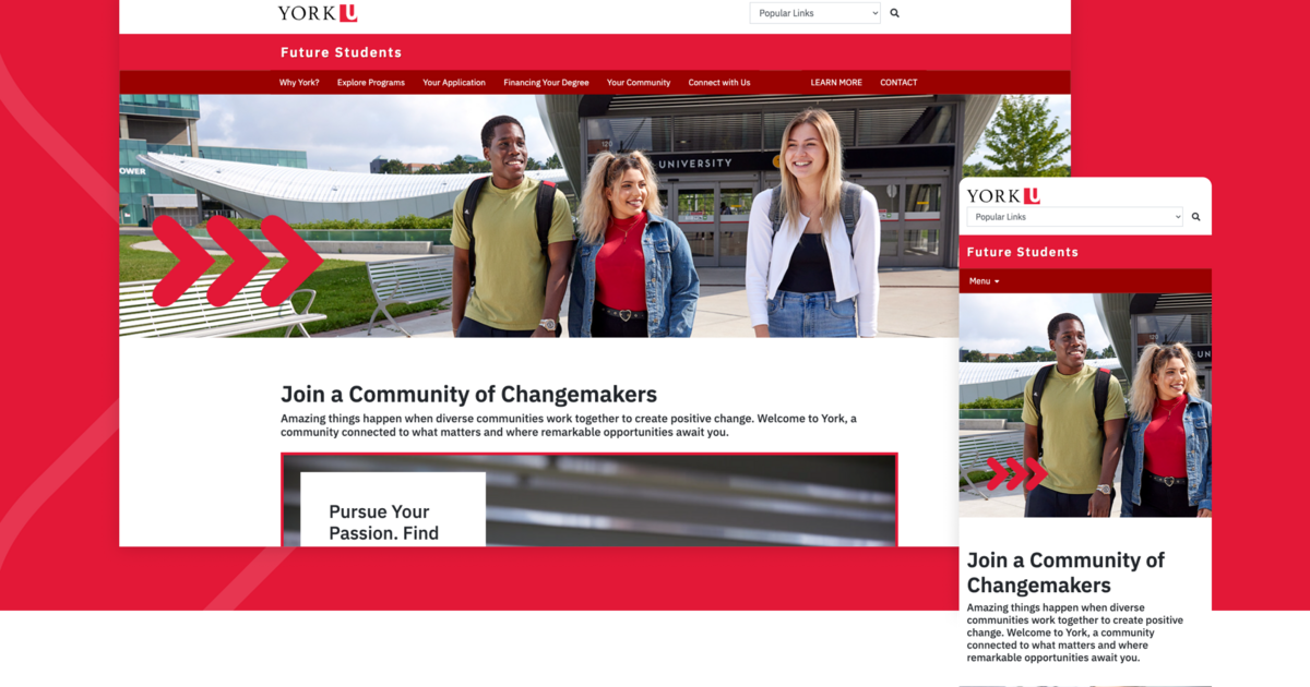- La page « Why York » a été remaniée afin de comprendre des témoignages, diverses images d'étudiants et des données pertinentes, la rendant plus attrayante, informative et invitante aux yeux des futurs étudiants.