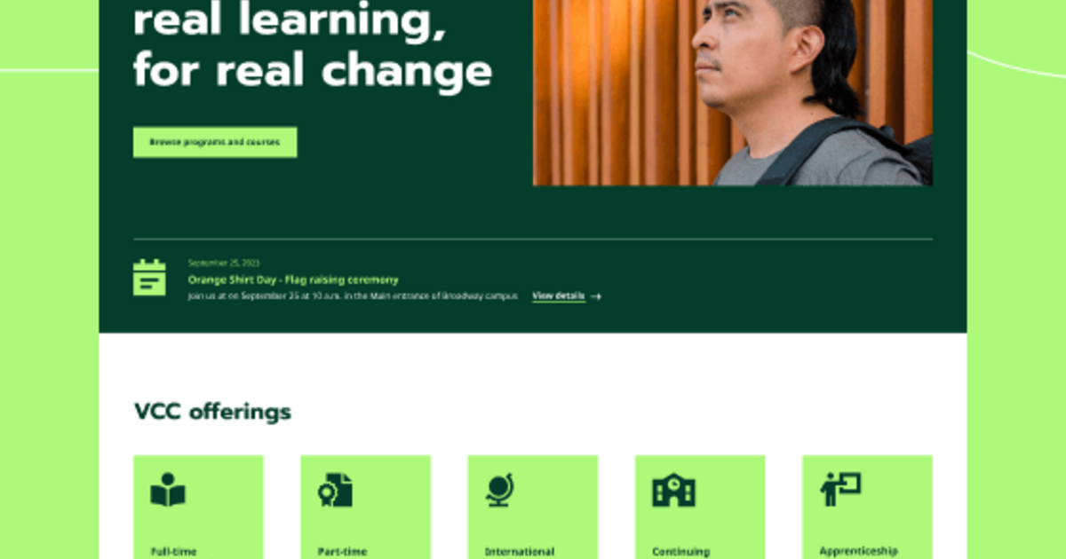 Evolving Web a procédé à la refonte du site Web du Vancouver Community College (VCC) dans le but de transformer la plateforme obsolète en un espace numérique moderne, convivial, engageant et qui honore l’identité autochtone de l’établissement. En concertation avec l’agence chargée de créer la nouvelle image de marque, notre équipe a adapté cette dernière au contexte numérique afin que le produit final soit accessible, que les couleurs et les éléments graphiques soient équilibrés, et pour attirer l’attention des utilisateurs sur le contenu et les appels à l’action. Un partenaire tiers du CCV développera et lancera le nouveau site Web en utilisant le nouveau design et le contenu amélioré.